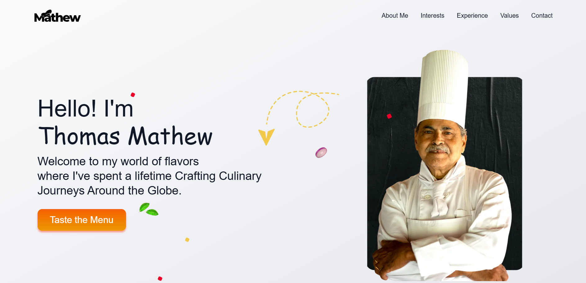 Elegant portfolio showcasing culinary expertise with smooth animations.